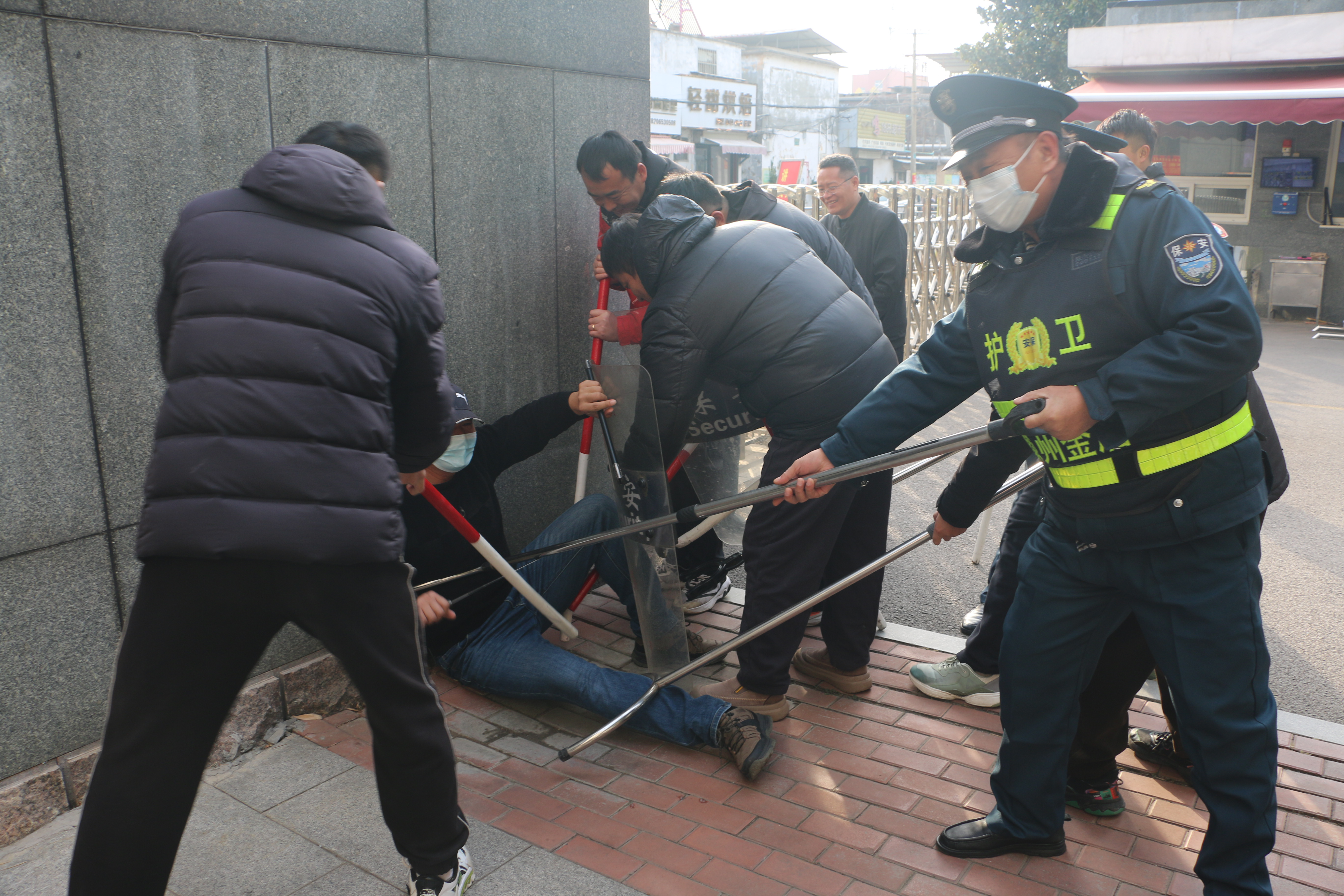 随着模拟“歹徒”强行冲撞校门的险情出现,演练正式开始。门岗安保人员第一时间发出预警信号,迅速拿起防暴器械上前拦截,与“歹徒”形成对峙。与此同时,值班教师立即关闭校门门禁,拉响应急警报,并通过校园对讲机向学校安全指挥中心报告情况。安保人员分工协作,一人持盾牌正面防御,两人持钢叉从两侧快速包抄,精准控制“歹徒”肢体,整套动作规范娴熟、配合默契,成功将“歹徒”制服并带离现场,整个处置过程高效有序,充分展现了校门值守队伍的应急处置能力。险情解除后,安保人员立即操作校园一键报警系统,将演练处置情况同步上报至辖区派出所及教育主管部门,完成全流程应急处置闭环。