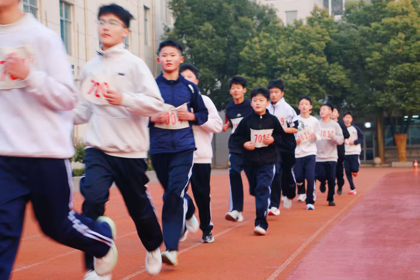 随着发令枪响,比赛有序启幕,七、八、九年级学生率先登场竞技。各年级均按性别划分组别依次开跑,学子们精神抖擞、队列齐整,迈着铿锵步伐驰骋赛道。